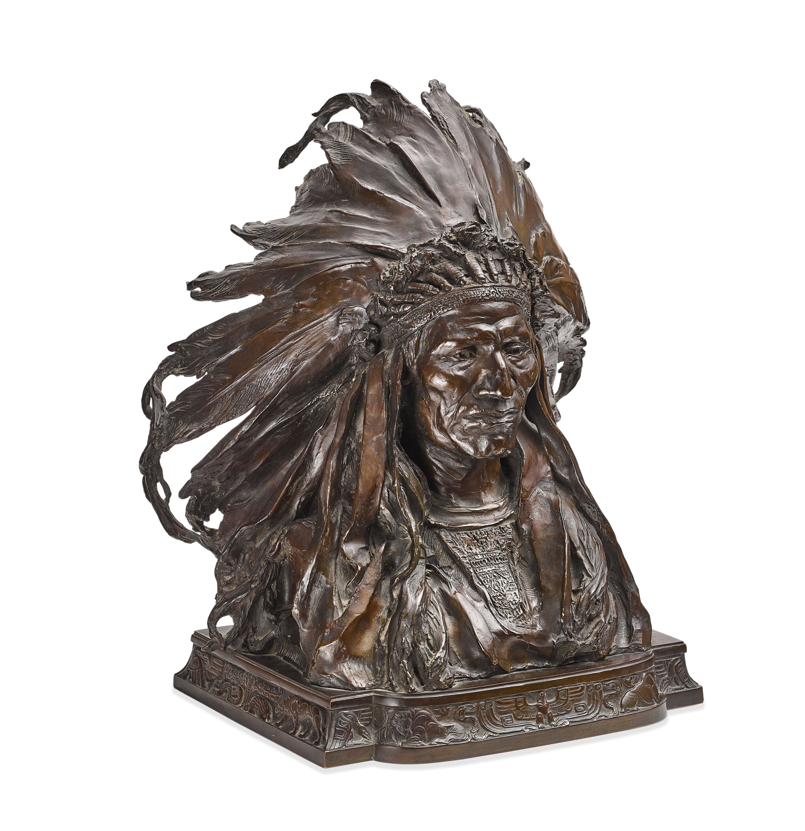 Adolph Weinman met Chief Blackbird, a veteran of the Great Sioux War of 1876, while Blackbird was performing in a Wild West show in New York. Inspired by this experience, Weinman later created one of his best known sculptural portraits, Chief Black Bird. The sculpture captures the Chief’s likeness along with his intricate headdress. This bronze bust from Adolph Weinman—along with 79 other works of fine art—is included in the upcoming Bonhams auction of Western Art.