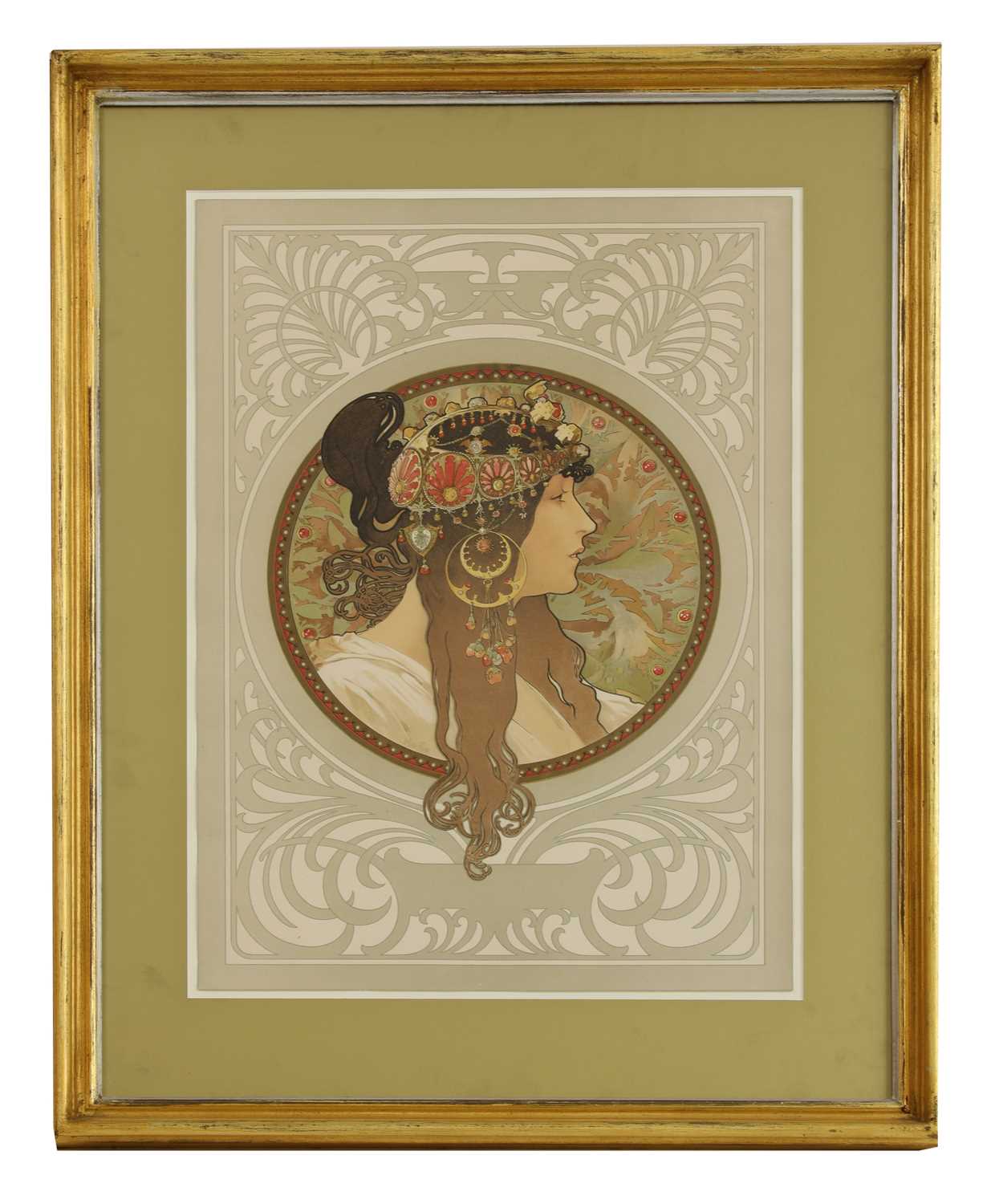 At the cutting edge of the Art Nouveau movement was Alphonse Mucha, a Czech designer active in the late 19th and early 20th centuries. Mucha’s hand was behind the Art Nouveau emphasis on beautiful women surrounded by stylized flora and fauna. Available in the upcoming Sworders auction of Arts & Crafts and Art Deco items is a pair of Mucha lithographs in the artist’s signature style. Tête Byzantine Brunette and Tête Byzantine Blonde show the heads of two women facing each other from opposite frames. Both figures wear jeweled hairpieces and translucent white garments.