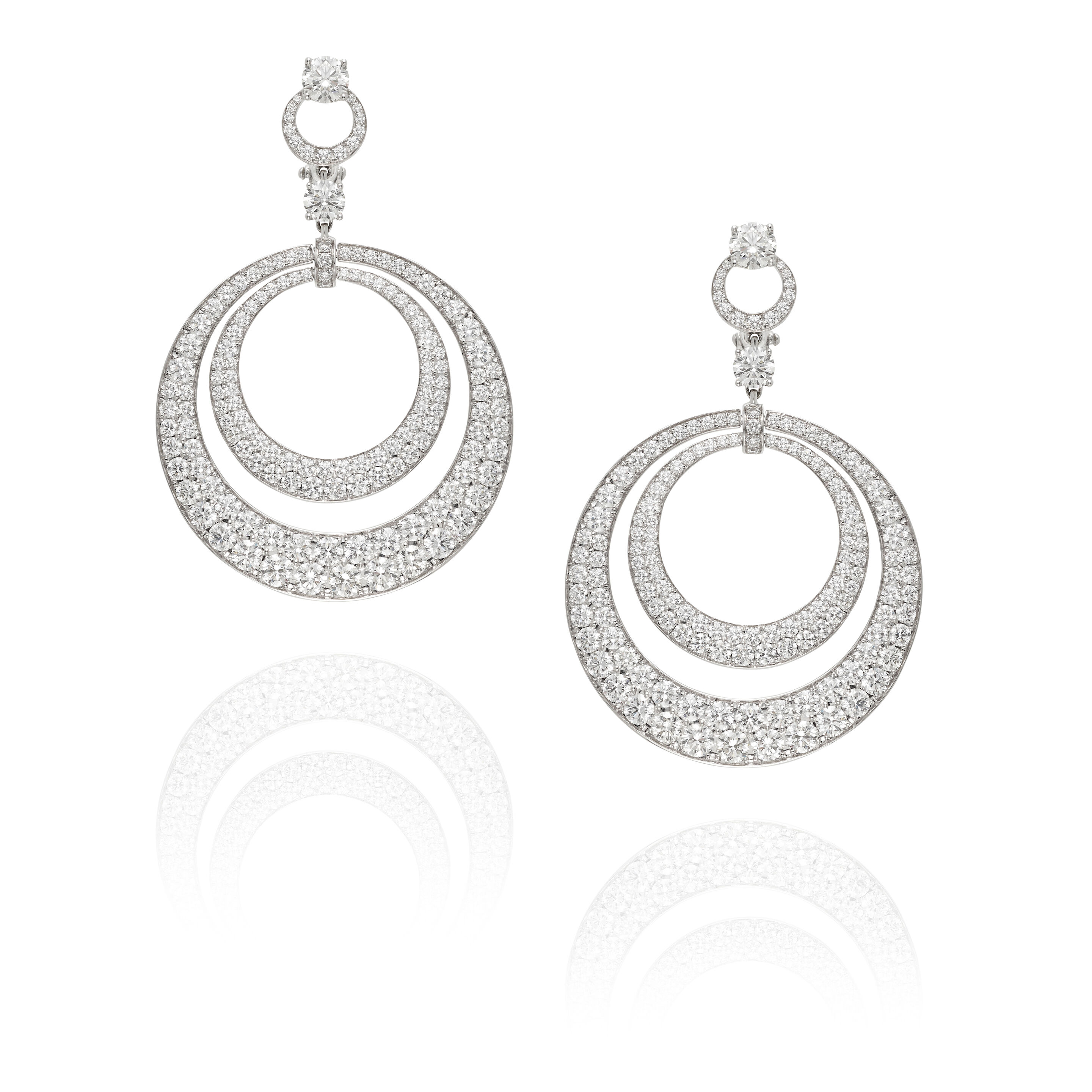 Laurence Graff founded his famous international jewelry brand in 1960. The company is known for its diamond and gemstone jewelry produced with the Kimberley Process, meaning the company does not buy or sell rough diamonds. The upcoming Bonhams auction presents diamond jewelry by Graff and other renowned jewelry brands. One highlight is a pair of 18-karat white gold and diamond pendant earrings by Graff. The available circular earrings feature pavé-set round-cut diamonds weighing 16.25 carats. The diamonds in the earrings are cut and polished by Graff’s Johannesburg division and carry a laser engraved tracking number.