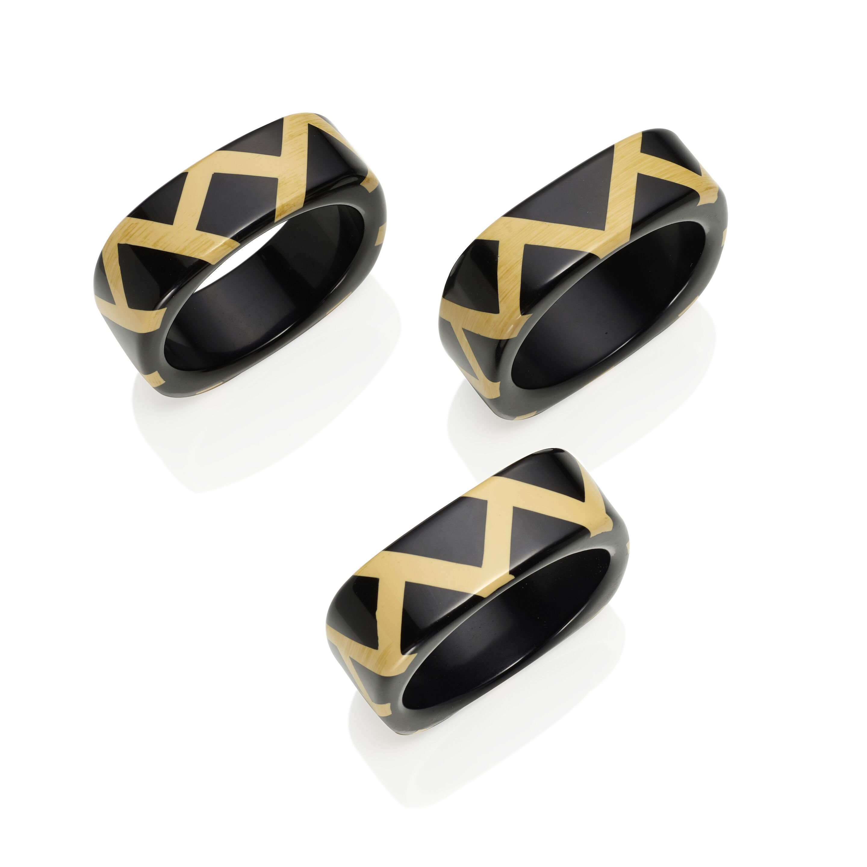 A hinged bangle bracelet is a key highlight of the sale. At the 1984 Art Deco Show in Philadelphia, the multicolored bracelet sold for $250, a record price back then. Another significant lot includes seven sets of salt and pepper shakers in shades of red, yellow, and green. Four of them come with an undertray. A set of three black and cream laminated bangle bracelets is noteworthy for its striking color combination. A set of 16 bird-shaped napkin rings also leads the listings. The bird is a particularly sought-after motif in Bakelite collectibles due to its vintage appeal. To view the complete catalog and register to bid online, visit Bonhams.