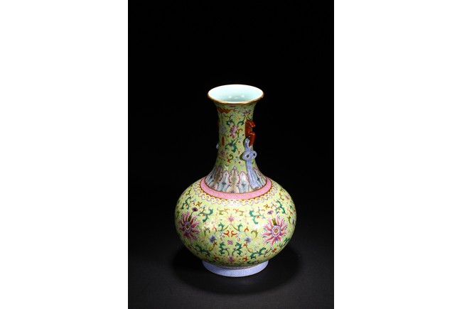 A FAMILLE-ROSE LIME-GREEN GROUND VASE |
