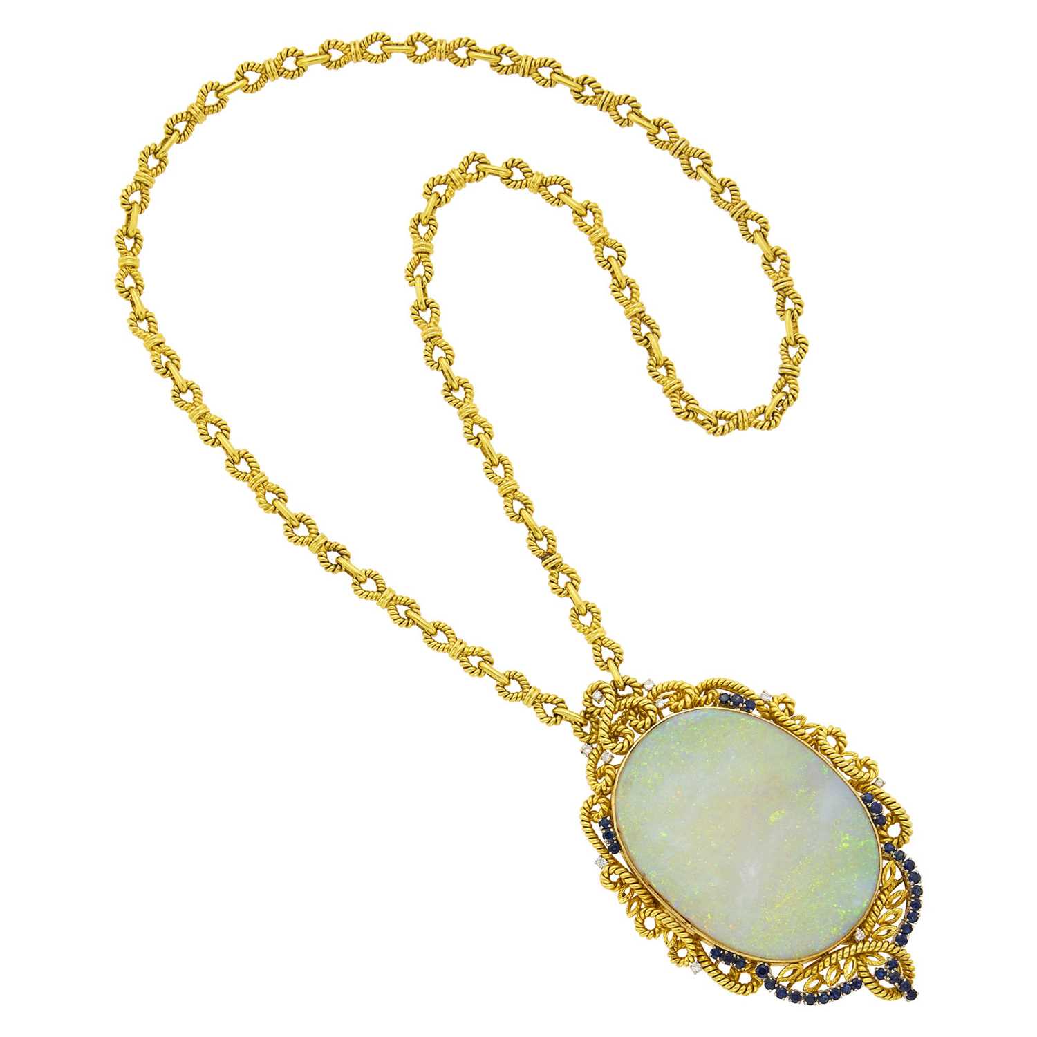 Long Gold, Opal, Diamond and Sapphire Pendant Chain Necklace |
