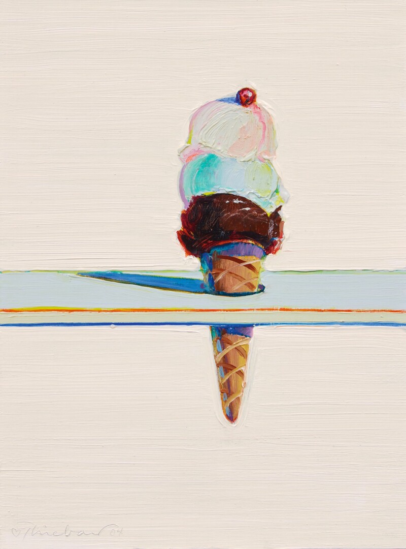 Also inspired by commodities is Wayne Thiebaud’s painting of an ice cream cone, titled Single Triple Decker. Unlike his Pop Art contemporaries, Thiebaud depicts products like cakes and ice cream without cynicism. “[W]here Warhol was cool and ironic,” the critic Cathleen McGuigan writes, “Thiebaud was warm and gently comic, playing on a collective nostalgia just this side of sentimentality.” Register to bid in this sale on the Sotheby’s website.