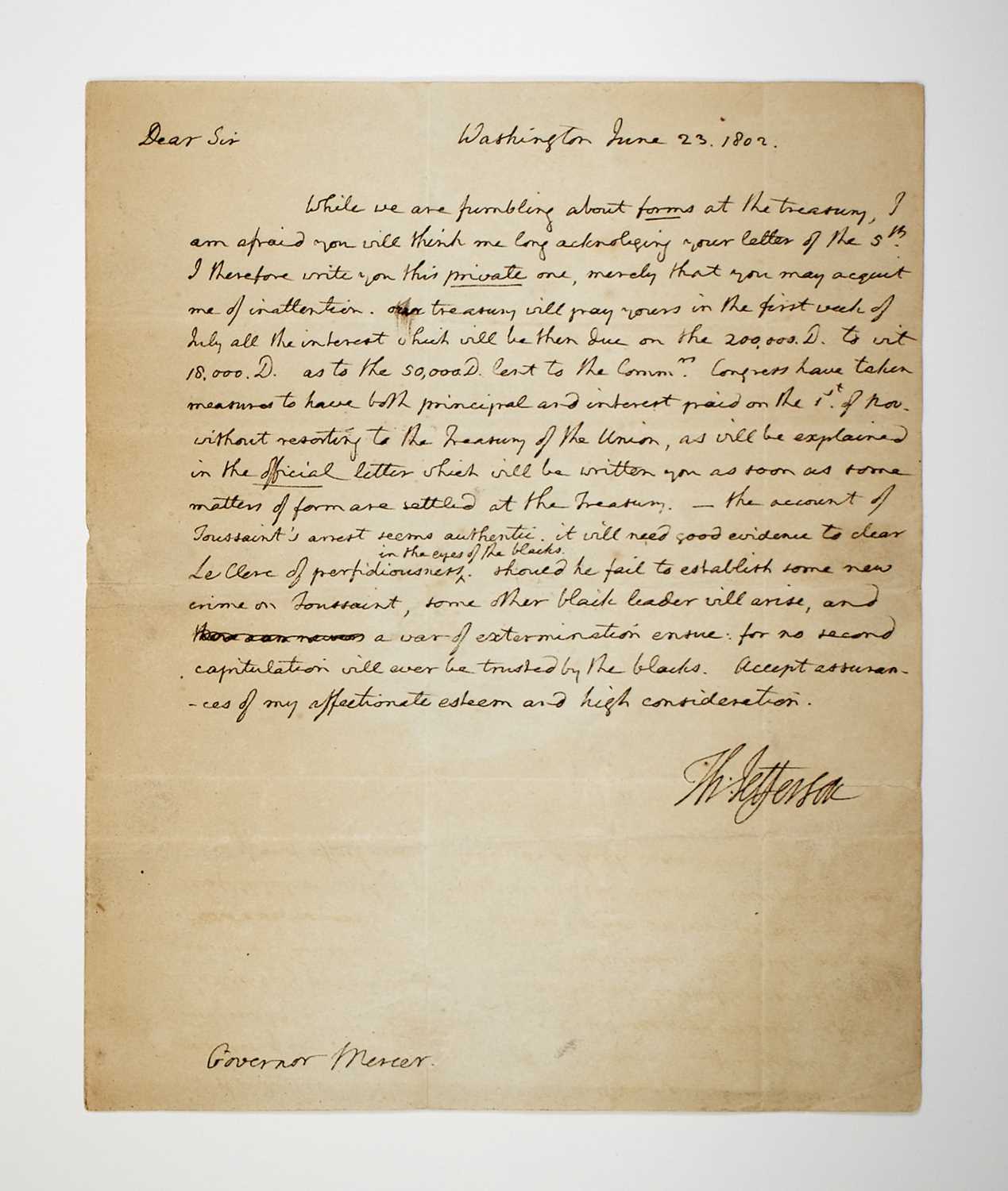 Thomas Jefferson expresses fears of a war of extermination in Saint-Dominigue |