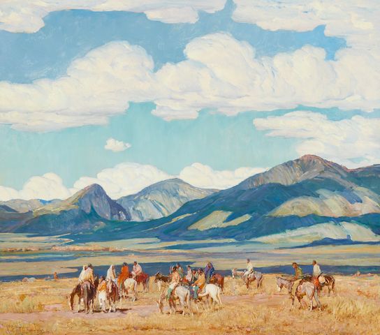 Representing Ernest Martin Hennings in this auction is the painting Indian Horsemen. After Harrison and Mayer sent him to Taos, Ernest Martin Hennings devoted himself to preserving the images of local Native American tribes. He postponed varnishing his works for as long as possible and applied only thin layers of paint to protect his artworks long-term. Collectors will notice the fruit of those efforts in the vibrant colors, particularly the yellow leaves, still present in Indian Horsemen.