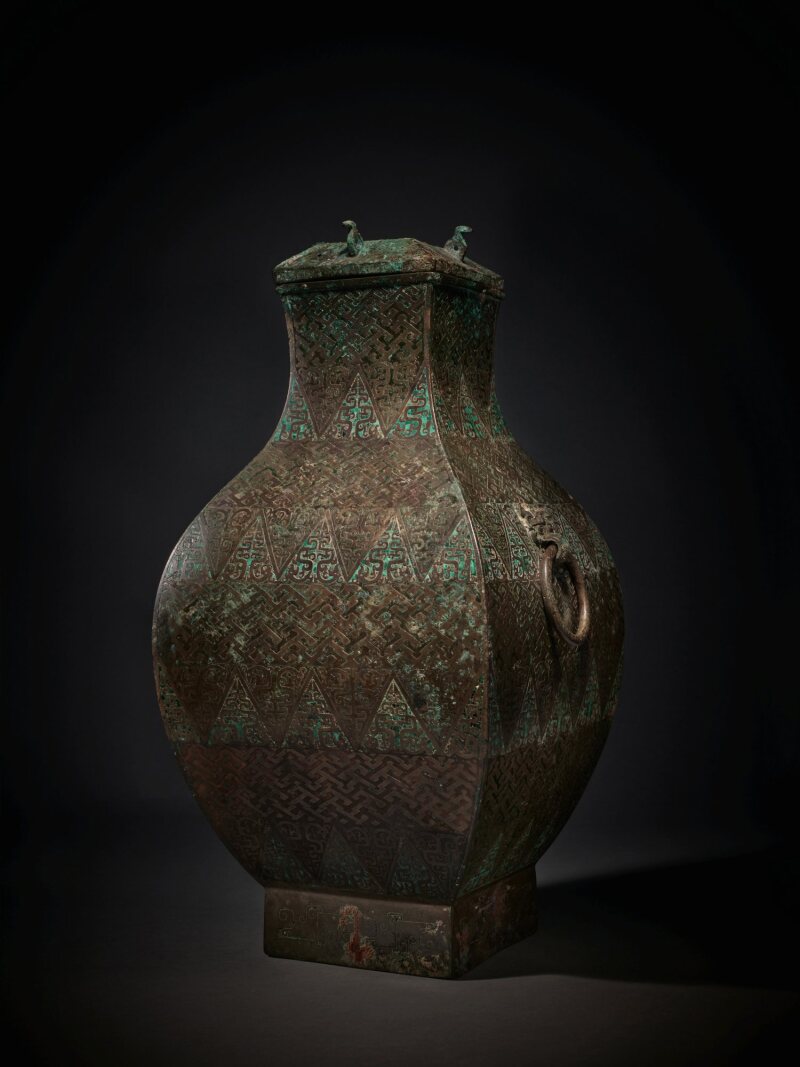A superb malachite and copper-inlaid bronze vessel and cover (Fang Hu), Eastern Zhou dynasty, Warring States period |