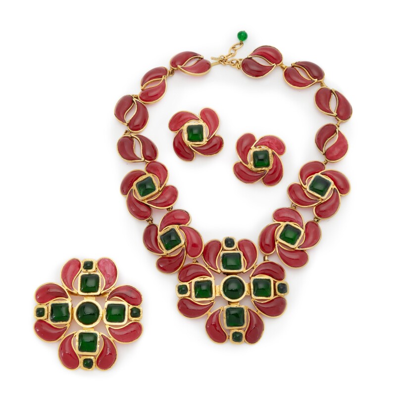 Chanel red and green Victoire de Castallane glass and gold metal suite. |