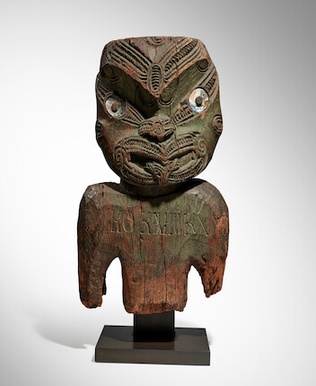 Other rare lots belonging to the indigenous Polynesian peoples include a carved war canoe tauihu. Most likely from the Bay of Plenty, the prow portrays a guiding figure at the front, signifying an ancestral commander. Behind is a median panel with two openwork double spirals. The traverse washboard portrays a figure directing the stern. A noteworthy wooden torso with hints of green paint also leads the listings. It most probably served as a stockade image crafted on the highest post within the defensive palisade to boost the morale of the community. Visit Bonhams to view the complete catalog and register to bid in the upcoming African and Oceanic Art sale.