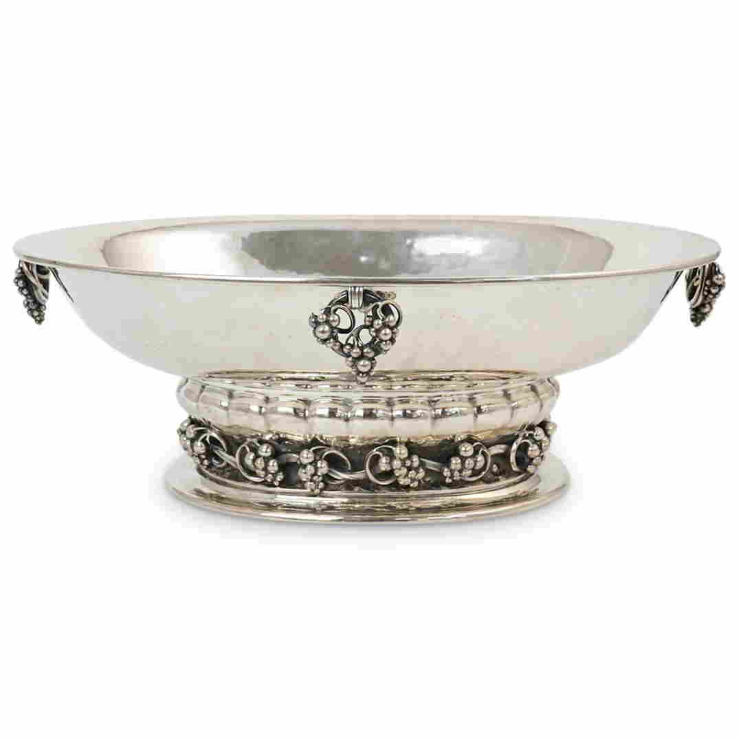Silverware and other estate treasures chosen personally by Mr. Jonathan Akiba will be available in Akiba Antiques’ upcoming spring auction. A Georg Jensen centerpiece in the Grape pattern is a leading lot. The large (11” wide) bowl sits on top of a sterling silver foot, also decorated with grapevines. The nature-inspired Scandinavian design by Georg Jensen honors his legacy as an innovator. Jensen is often counted among the leading silversmiths of the 19th and 20th centuries. He regularly blurred the lines between artistry and craftsmanship in his works.