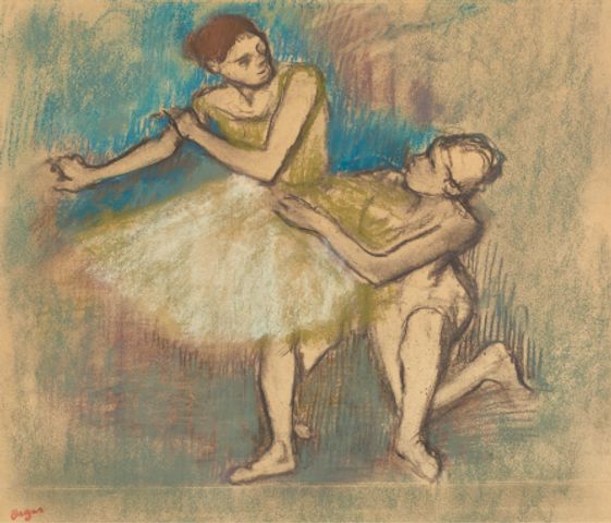 Scène de ballet, Arlequin et Colombine, pastel on joined paper laid down on card by Edgar Degas. |