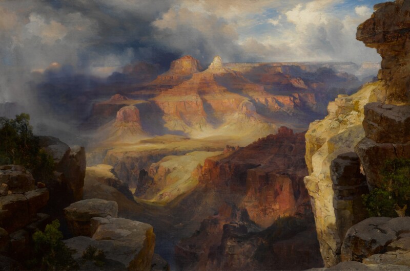 Representing Thomas Moran in this sale is Grand Canyon, Arizona. Originally born in England, Moran eventually moved with his family to America and used his paintings to advocate for the country’s National Park Service. In this painting, Moran uses passing rain clouds to experiment with varying light and colors across the canyon.