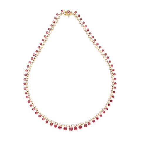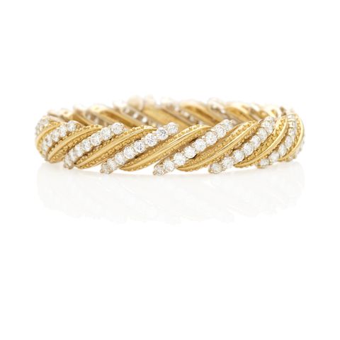 Born in Austria in 1909, Kurt Wayne began his apprenticeship with a jeweler at the age of ten. He honed his skills as a diamond setter, goldsmith, and silversmith. In 1939, Wayne boarded a ship to New York City to set up his own office. He later became a leading jeweler of the United States. A Kurt Wayne 18-karat gold necklace with graduated round rubies and diamonds will lead Bonhams’ upcoming jewelry sale. A two-color gold and diamond bracelet by Hammerman Brothers is also on offer. With alternating links of textured gold and round diamonds, the bracelet measures 7.75 inches long.
