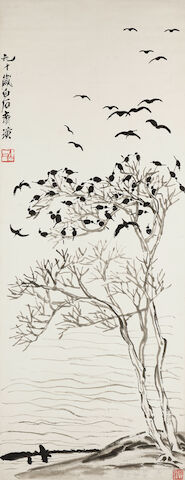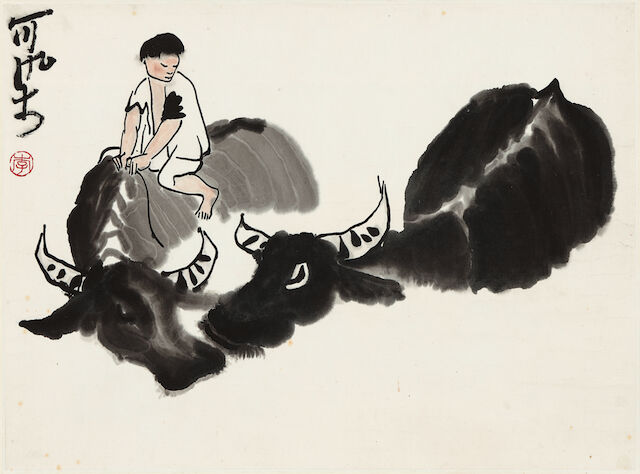 Also showcased are whimsical artworks by notable contemporary Chinese painter Qi Baishi. Crows Return to Wintry Trees depicts a winter scene. Several crows fly around branches of a tree on the waterfront. Influenced by artists such as Xu Wei and Zhu Da, Qi was famous for his whimsical style. Li Keran’s Washing the Water Buffalo is another highlight. It depicts the painter’s favorite subject: a herd boy and water buffalo. Li’s artworks feature an amalgamation of Chinese calligraphy and oil painting. The available artwork employs his unique splashed ink technique and use of shadowing. The auction also presents a folding fan with calligraphy inscriptions by Li Ruiqing, a scroll painting by Lin Fengmian, and a mythological scene by Shi Lu. Interested collectors can explore the entire listings and register to bid online on Bonhams.