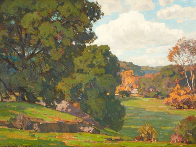 Among the key highlights of the sale is Along the River Bed by William Wendt (1865 – 1946), a German-born American landscape painter. Known as the “Dean” of Southern California landscape painters, Wendt adopted the French Impressionist style. He found Southern California to be the perfect setting to translate his ideas about color and light. Another oil on canvas by Wendt, In the Shadow of the Grove, features vivid brush strokes and a multi-layered color scheme. In 1907, the Union League Club of Chicago purchased In the Shadow of the Grove. The Club displayed the piece for decades before it headed to auction. To view the complete catalog and register to bid online, visit Bonhams.