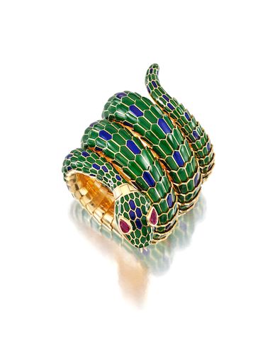 18k gold, ruby and enamel Serpenti watch by Bulgari, Jaeger-LeCoultre. |