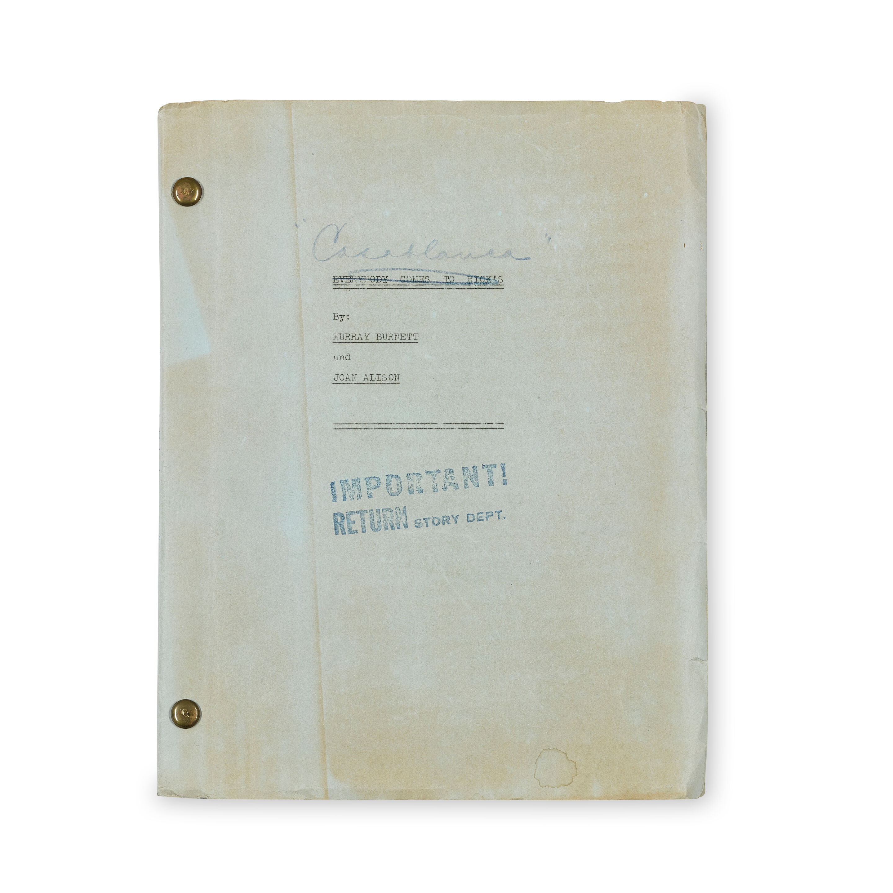 Warner Brothers purchased the rights to Everybody Comes to Rick’s (1940) from American playwrights Murray Burnett and Joan Alison. Hal Willis bought the manuscript for $20,000, a record-breaking amount at the time. The company then adapted the play into Casablanca (1942), starring Humphrey Bogart and Ingrid Bergman. A mimeographed copy of the original playscript will lead an upcoming Bonhams auction. The 101-page copy is bound with brads and has “Wharton & Gabel” type-written on the title page. “Important! Return Story Dept.” is stamped on both the title and cover pages.