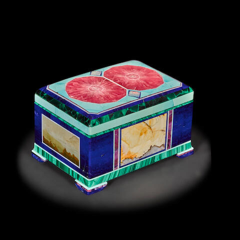 The auction also features intarsia boxes and jewelry from award-winning artist Nicolai Medvedev. Born in the Republic of Turkmenistan, Medvedev brought the art of intarsia with him to New York. Intarsia is a centuries-old lapidary technique. Few contemporary artists like Medvedev have mastered this skill. Medvedev makes his jewelry boxes with malachite, lapis lazuli, turquoise, marble, and opal. Visit Bonhams to view each lot and place a bid.