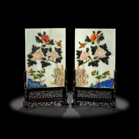 Two Multi -gemstone Carved Table Screens |