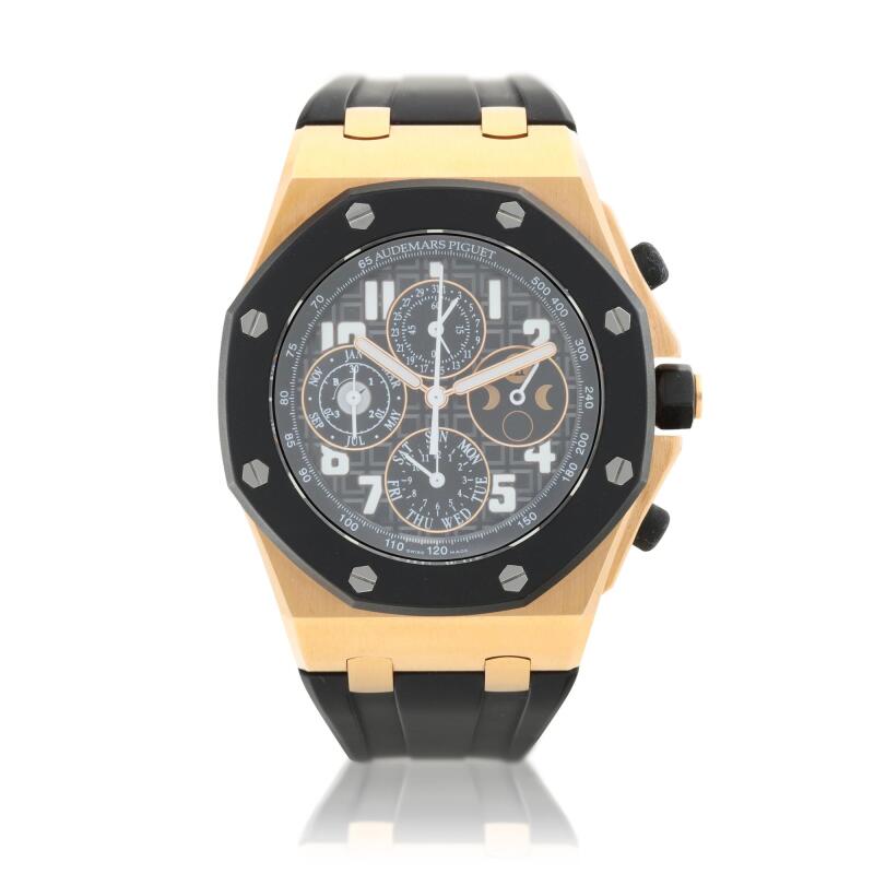 In the upcoming Sotheby’s fine watches auction, numerous Swiss luxury timepieces will be available. Particularly showcased is an Audemars Piguet Royal Oak Offshore ‘Restivo’ watch. Making its first appearance in 1993, the Royal Oak Offshore collection lends a sportier look to the traditional wristwatch. Measuring 44 millimeters in diameter, this 2015 limited edition watch features a black dial surrounded by 18-karat pink gold and a rubber-clad bezel. The Audemars Piguet logo is located on the watch’s case, dial, movement, and pink gold folding closure. A Certificate of Origin book and an Audemars Piguet presentation box come with this lot.