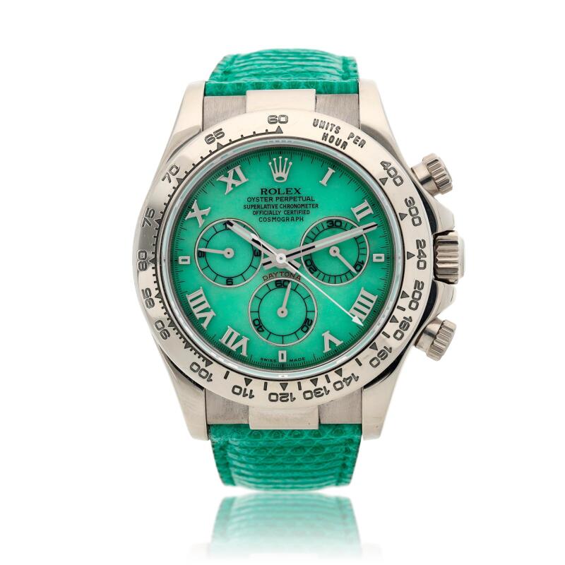Also included in the auction is a 2001 Rolex Daytona Beach wristwatch. The green dial, 18-karat white gold case, and green band together measure 40 millimeters in diameter. The Rolex signature can be found on the watch’s case, dial, and movement. It comes with a Rolex presentation box and outer packaging, as well as a service guarantee from 2008, a polishing cloth, and a hang tag. Visit Sotheby’s to view the entire collection of fine watches and to place a bid.