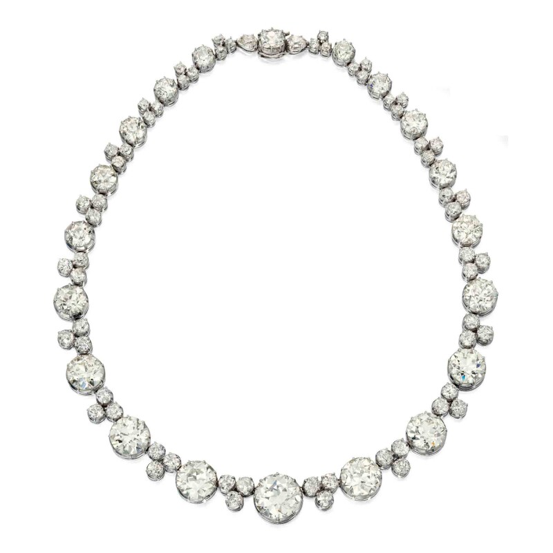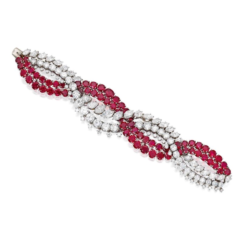 An Italian luxury company, Bulgari is also represented with a Diamond Rivière necklace. A Harry Winston ruby and diamond bracelet can also be found along with a Van Cleef & Arpels colored diamond pendant brooch. View the whole collection and register to bid at Sotheby’s.