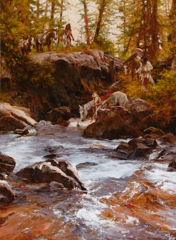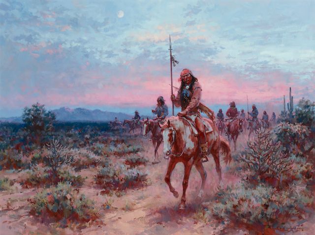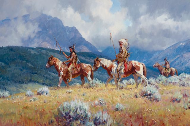 Martin Grelle is best known for capturing the spirit of Native American and cowboy culture in his paintings. One of Grelle’s oil paintings, titled Warriors, is available in the upcoming auction presented by Bonhams. This piece shows three Plains warriors riding across a mountain.
