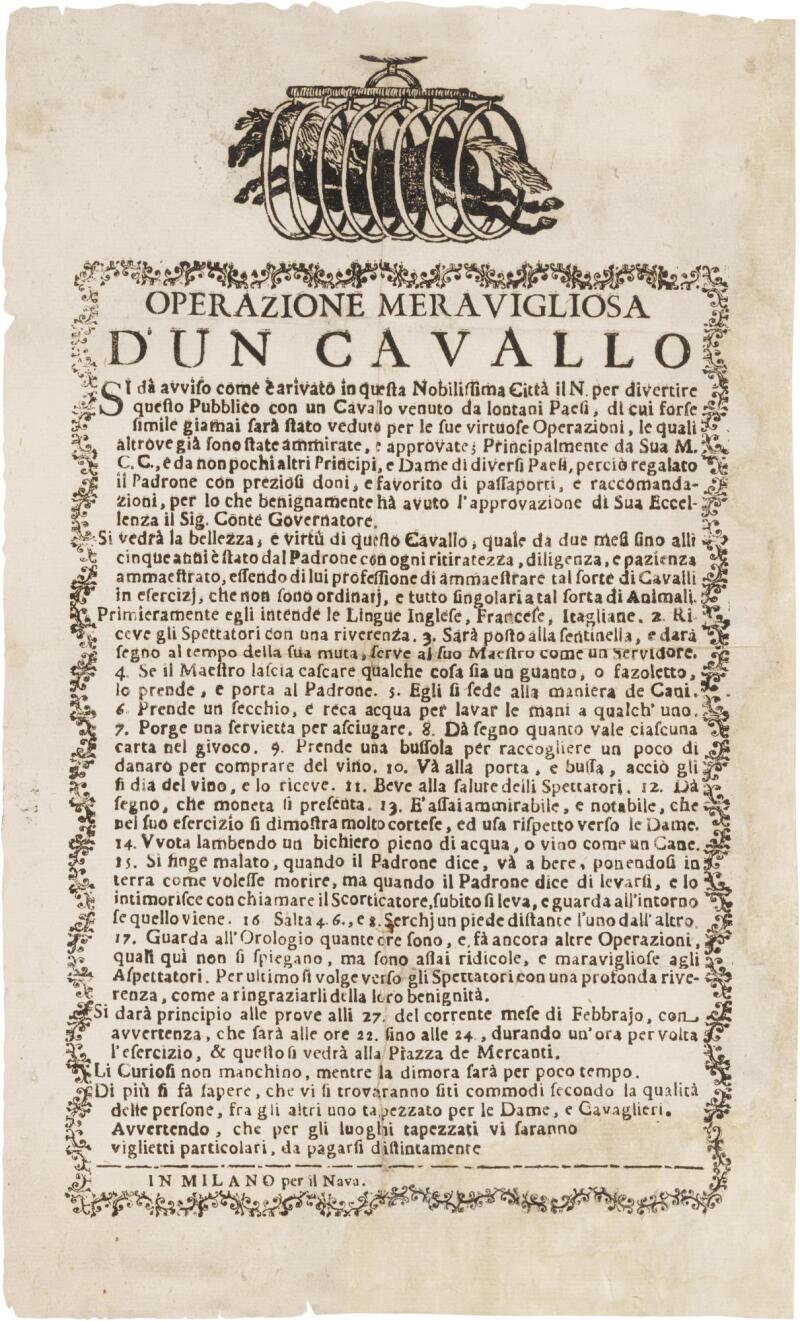 (Learned Animals, Horses) An early playbill advertising an accomplished horse |