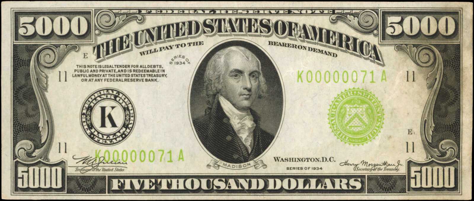 | Fr. 2221-K. 1934 $5000 Federal Reserve Note. |