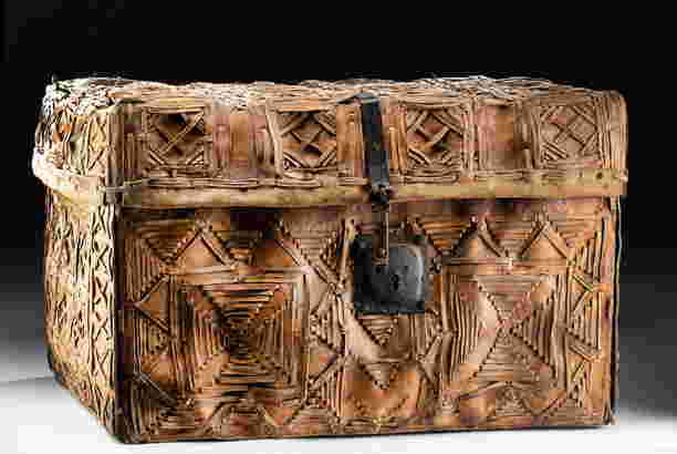 Among the fine art pieces on offer is Hippolyte Victor Valentin Sebron’s painting titled Niagara Falls, The Horse Shoe. A French artist, Sebron was best-known for his detailed landscape and cityscape scenes. Executed in 1852, the available work shows Niagara Falls rendered in pastel colors. An 18th-century New Mexican traveling trunk is also on offer. Made of rawhide leather, the box features Aztec-inspired geometric decorations, iron hinges, and a lock on the front. Interested collectors can register to bid for this auction on LiveAuctioneers.