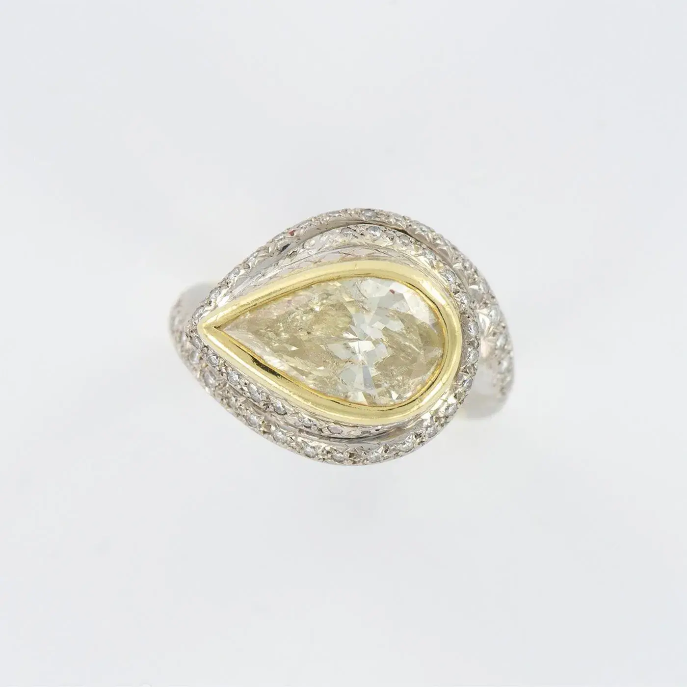 Beautiful ladies statement ring in 18K Yellow and White Gold with pear shaped 4.2ct Yellow Diamond and about 1ct small diamonds around. Size 7.5. Weight 12 grams. Marked 18K and STN trademark.