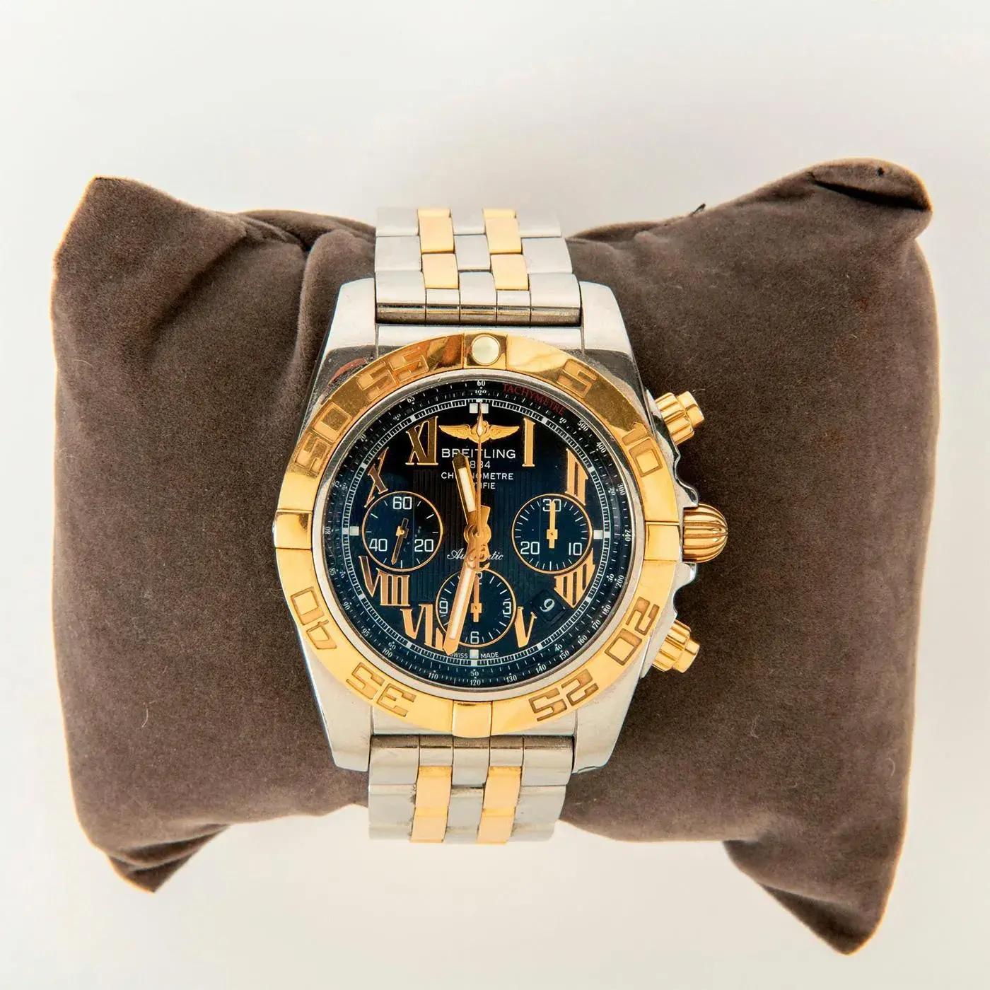 Automatic Men’s Breitling Watch in 18K gold and stainless steel with black face with Roman numbers. Case size: 43.5mm. Will perfectly fit a wrist of approx. 3.5″. Comes with original storage case, box and papers.
