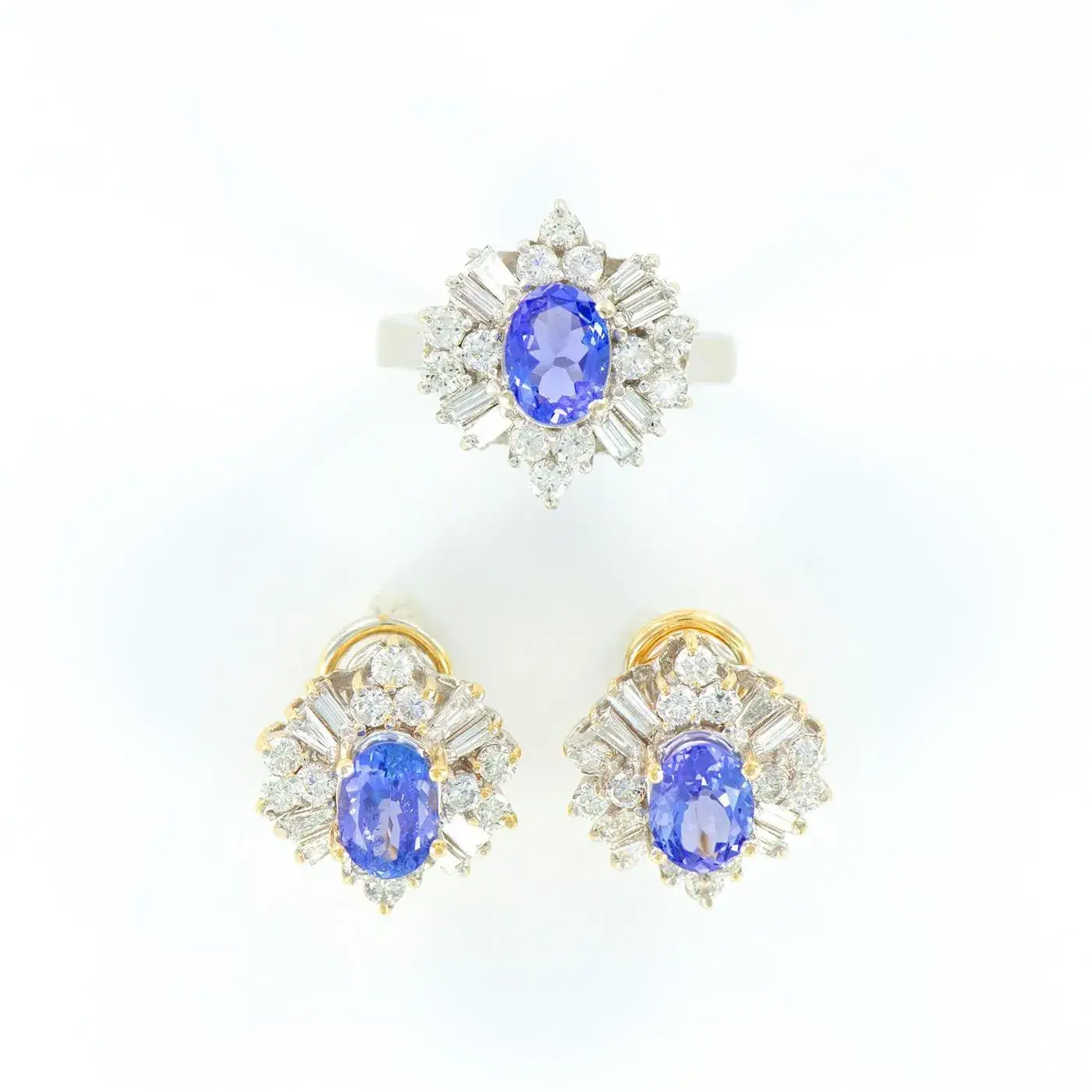 Elegant lot includes:Earrings: Diamond and Tanzanite Ring: Diamond and Tanzanite. 8.70 cts. total weight 36 Round Brilliant Diamonds – 2.20 cts. 24 Baguette Cut Diamonds – 2.00 cts. Color F-G, Clarity VS3, 8 mm X 6 mm oval Tanzanite 4.50 cts.Marked GF 14K- White Gold. Size: 8