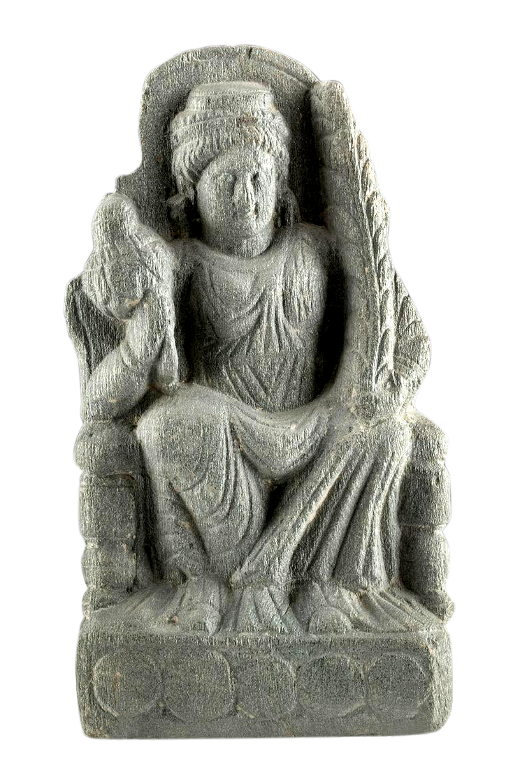 Central Asia, Pakistan, Taxila region, Gandharan, Kushan period, ca. 3rd century CE. A striking hand-carved grey schist high relief depicting the goddess Hariti dressed in a belted toga and seated on a throne. Adorned with bangles, a collared necklace, a flat-topped tiered tiara, and dangling earrings, the deity holds a pomegranate in her right hand and wheat in her left as she calmly looks outward toward the viewer from almond eyes over a flat nose and small closed mouth. Both of her feet rest below her on a dais decorated with five circles. Deposits of mica in the schist create a beautiful sparkling effect throughout the sculpture. Note the fine attention to drapery of her toga; a classical stylistic quality inherited from Alexander the Great’s conquest of Gandhara in 330 BCE. Hariti’s iconographic likeness to the Greek goddess Tyche via her wheat, pomegranate, and flat topped crown is further indicative of the Greek influence on the region. A rare example of Greco-Buddhist art that demonstrates a strong syncretism between eastern and western traditions. Stand for photography purposes only. Size: 3.75″ L x 1.125″ W x 6.75″ H (9.5 cm x 2.9 cm x 17.1 cm)