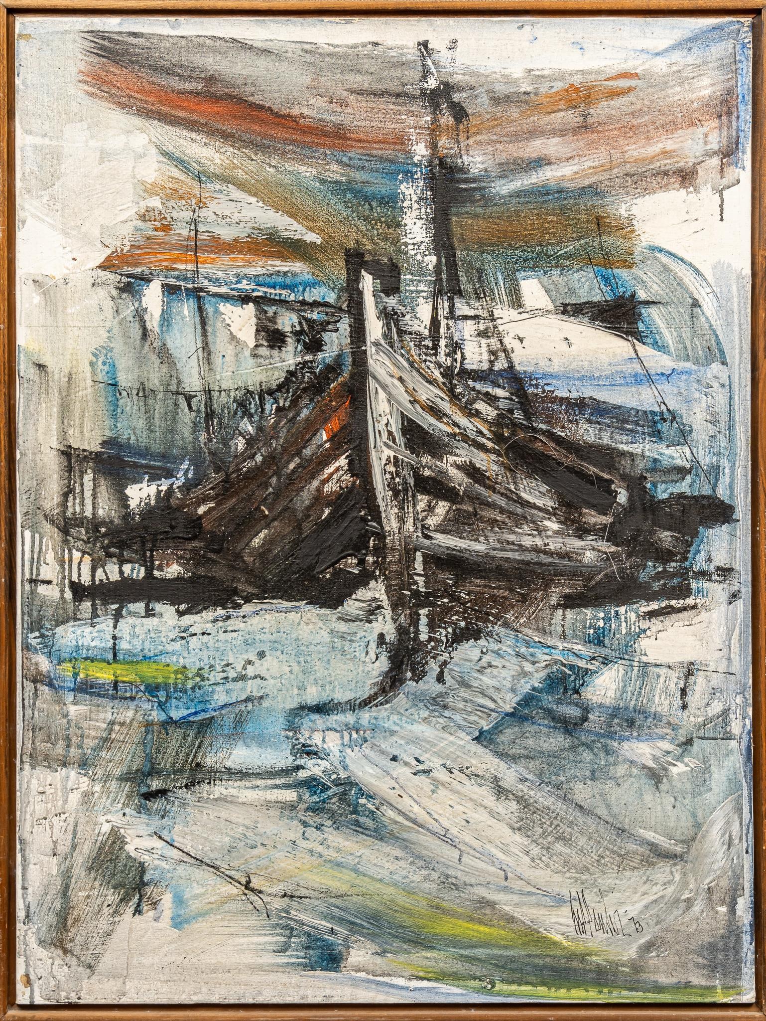 Gino F. Hollander (California / Spain, 1924-2015), abstract sailboat composition, 1973, oil on canvas